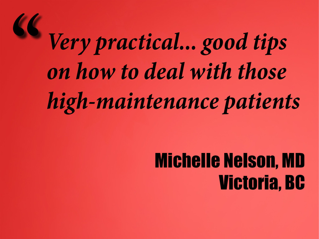When you review your appointment list for the day, do some names lead to a “heart sink” feeling? Odds are some patients disproportionately drain you—that is, until you get the appropriate training in CBT’s “psycho‐judo”. In this year’s “Difficult” Patients workshop, we review practical and powerful tools to supplement your existing approaches to three conditions that needlessly deplete the caring physician: borderline personality disorder, hypochondriasis (“illness anxiety disorder” in DSM‐5), and suicidality. You’ll learn many techniques that can significantly improve patient outcomes—while making your life a lot easier.