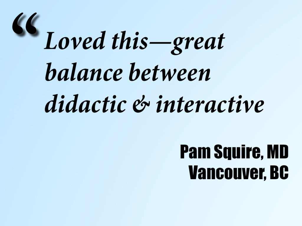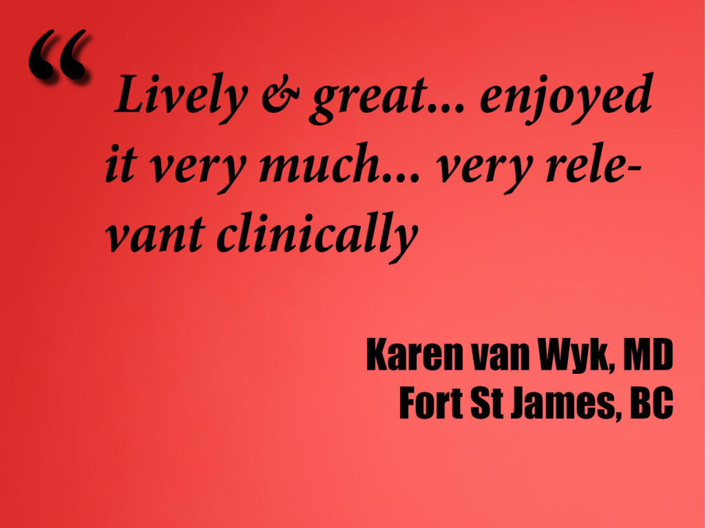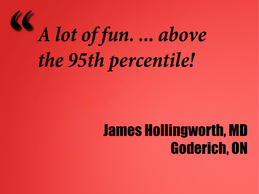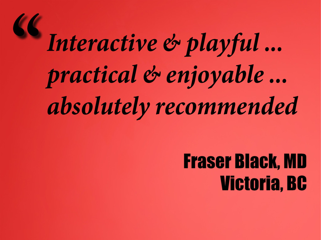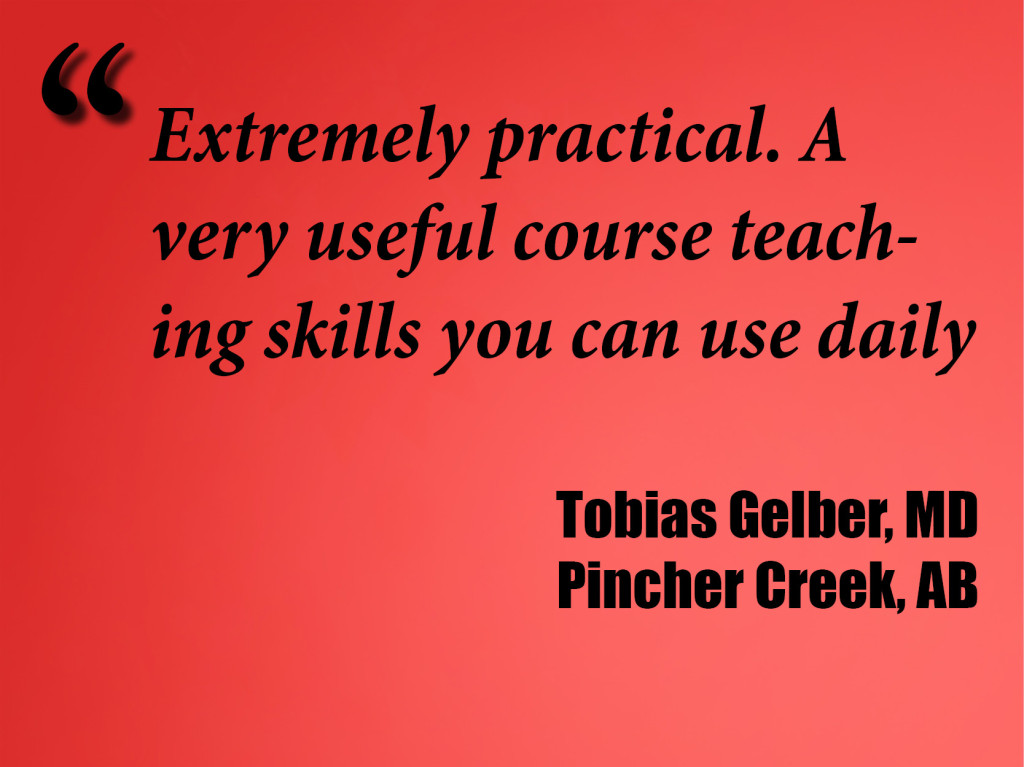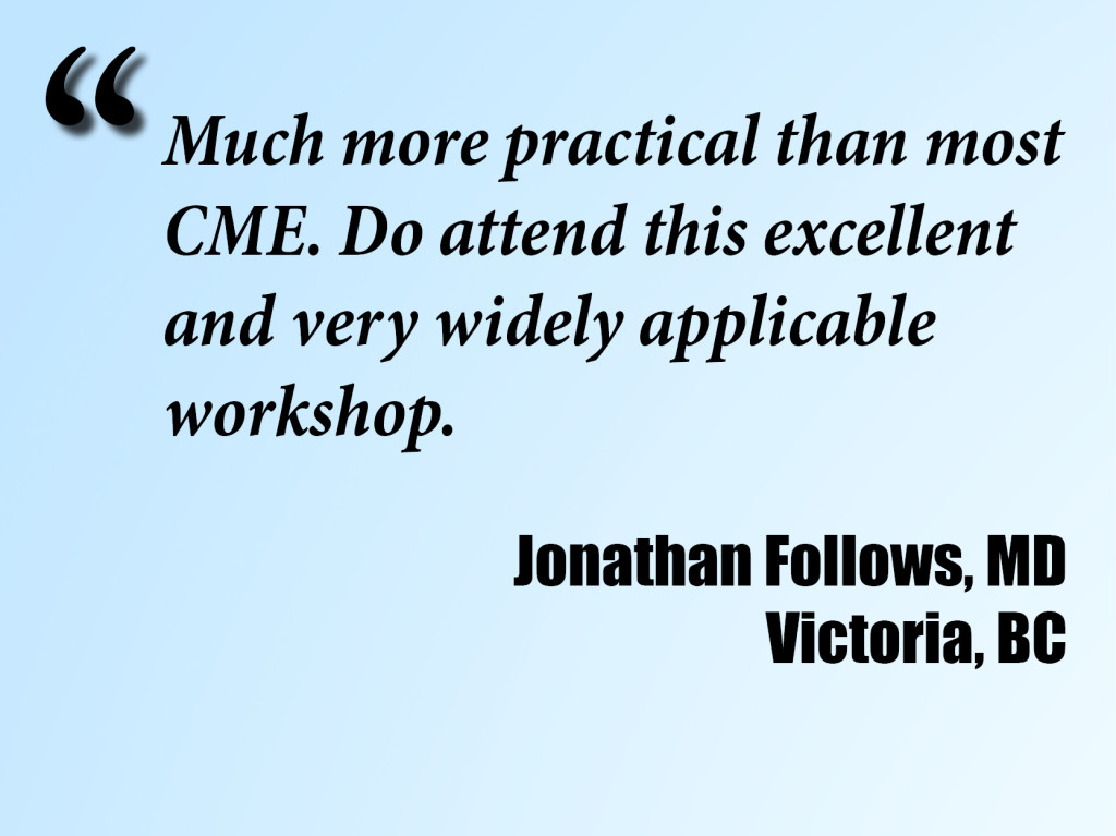 Head instructor Greg Dubord, MD is limber like a monkey from giving over 300 workshops, and a recent University of Toronto CME Teacher of the Year. Assistant faculty includes the inimitable addictionologist Leo Lanoie, MD, FCFP, DABAM and polymath alliance-ologist Ivan Ratnayake, MBBS, MRCGP, FRCS.