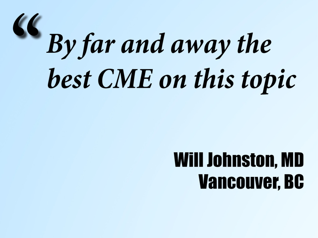 100% of our 2021 workshops will be held online. Sure, we'd all love to start travelling again—but let's be patient & prudent with the end of the pandemic now in sight. Mid-2021 we'll begin bookings for our 2022 vacation CME. In the meantime, stay safe—and please consider our Zoom trainings. They have some pluses over in-person workshops.