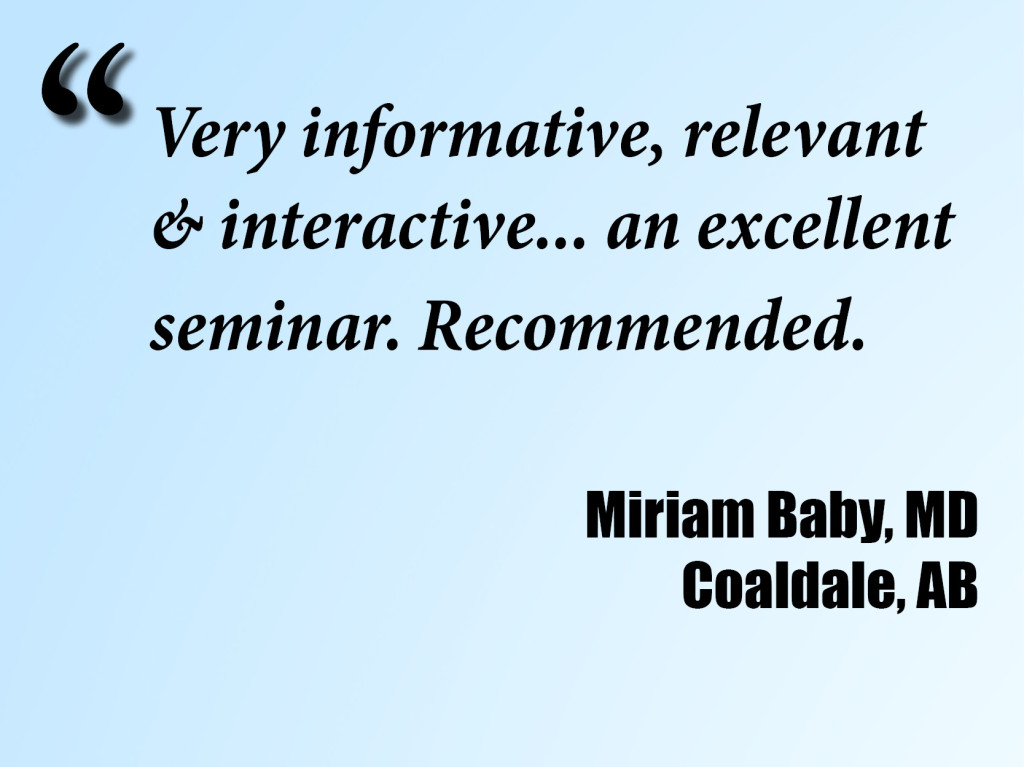 The Blue Mountain workshop (i.e., CBT for Anxiety) has been very positively reviewed by participants; e.g., at Family Medicine Forum and Primary Care Today.