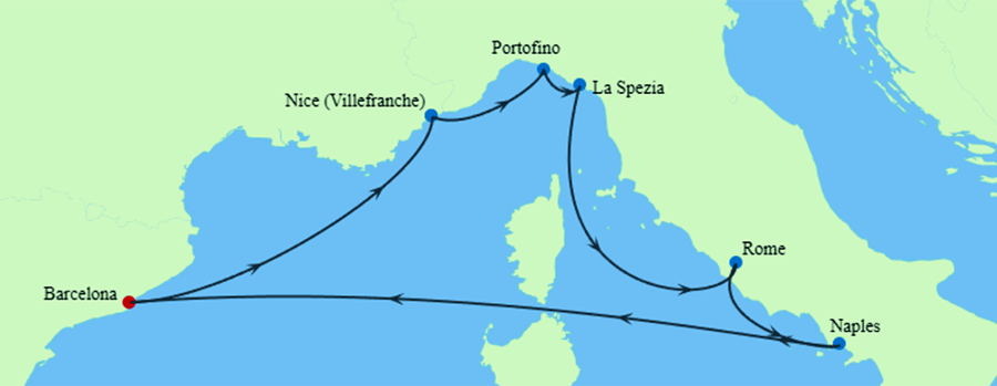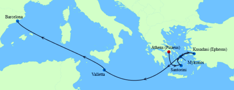 * 7 countries & 16 unique ports: France (1): Villefranche (Nice/Monaco); Greece (3): Piraeus (Athens), Santorini, Mykonos; Italy (4): Portofino, La Spezia (Florence/Pisa), Civitavecchia (Rome), Naples (Pompeii/Amalfi Coast); Malta (1): Valletta; Morocco (1): Tangier; Spain (5): Barcelona, Palma de Mallorca, Ibiza, Cadiz (Seville), Malaga; Turkey (1): Kusadasi (Ephesus).
